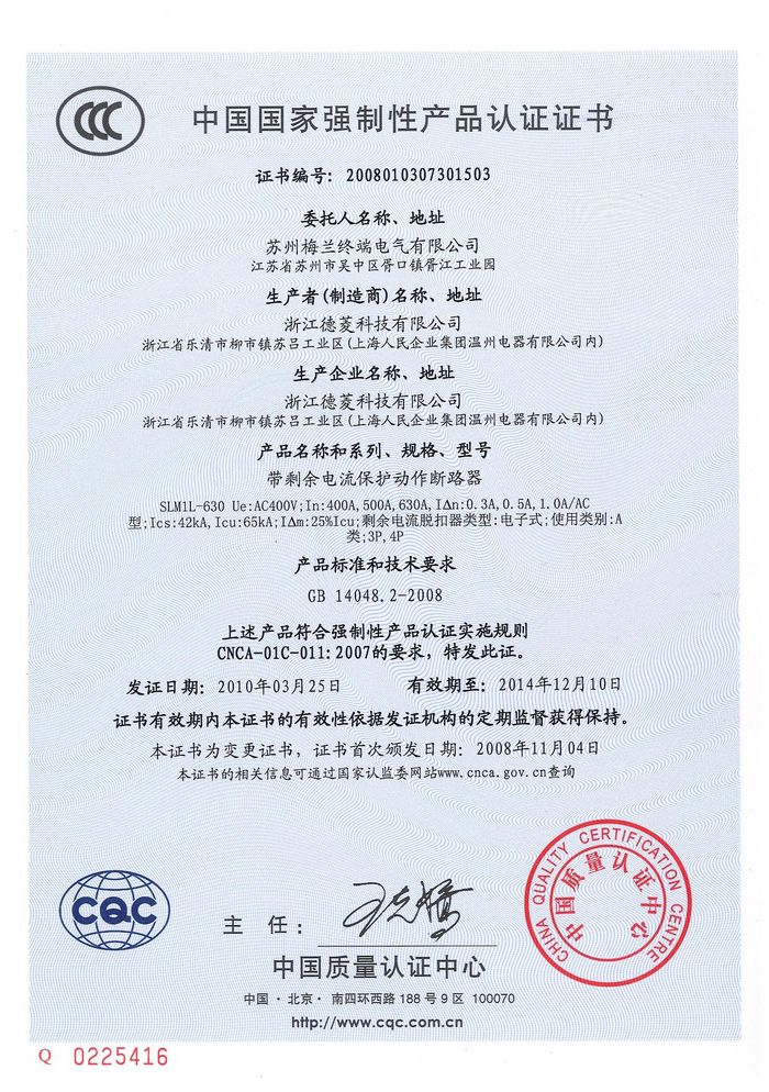 SLM1L-630塑殼漏電資質(zhì)證書
