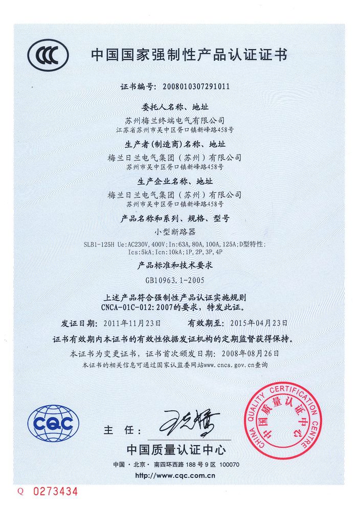 SLB1-125H小型斷路器資質(zhì)證書