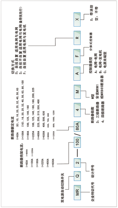 用戶(hù)在訂貨時(shí)應(yīng)按第4項(xiàng)的型號(hào)及含義注明智能系統(tǒng)的型號(hào),規(guī)格斷路器框架電流、極數(shù)、額定脫扣電流、功能、切換方式。 例如:MRQ2-100/63/4M/B/R智能雙電源自動(dòng)切換系統(tǒng),塑殼斷路器殼架電流為100A,額定脫扣電流為63A,四級(jí)、電網(wǎng)對(duì)發(fā)電、自投自復(fù)。